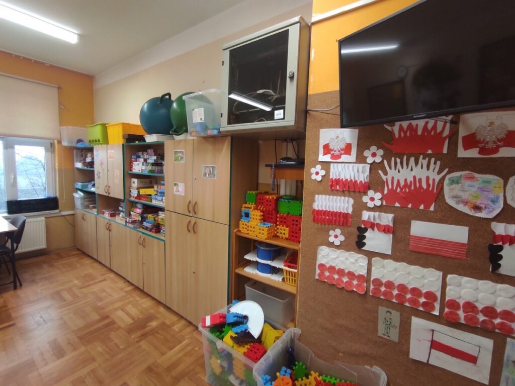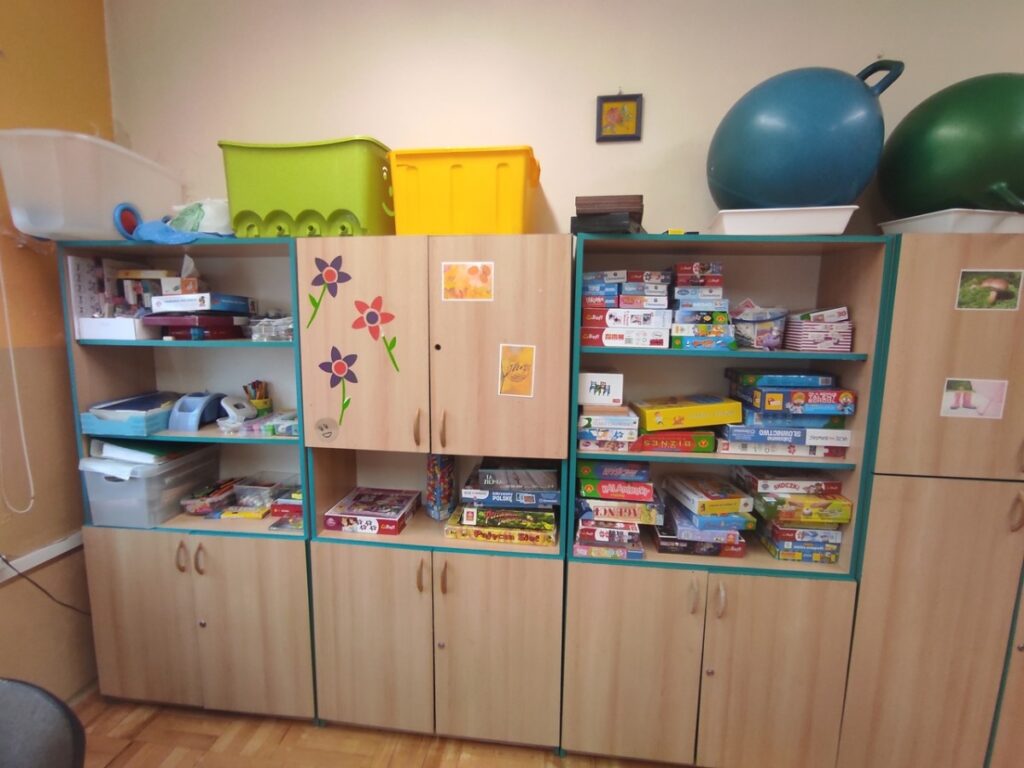 W klasach IV-VIII wydzielone są szafki i półki dla każdego ucznia na podręczniki i pomoce szkolne.